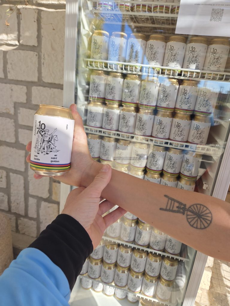 La Route de Saint-Guidon (La poésie se charge de tout),edition of 1070 cans, 2025.Holy water, aluminium cans, print on paper,fridge, vinyle letters,Nage Libre, Dieulefit, 2025.